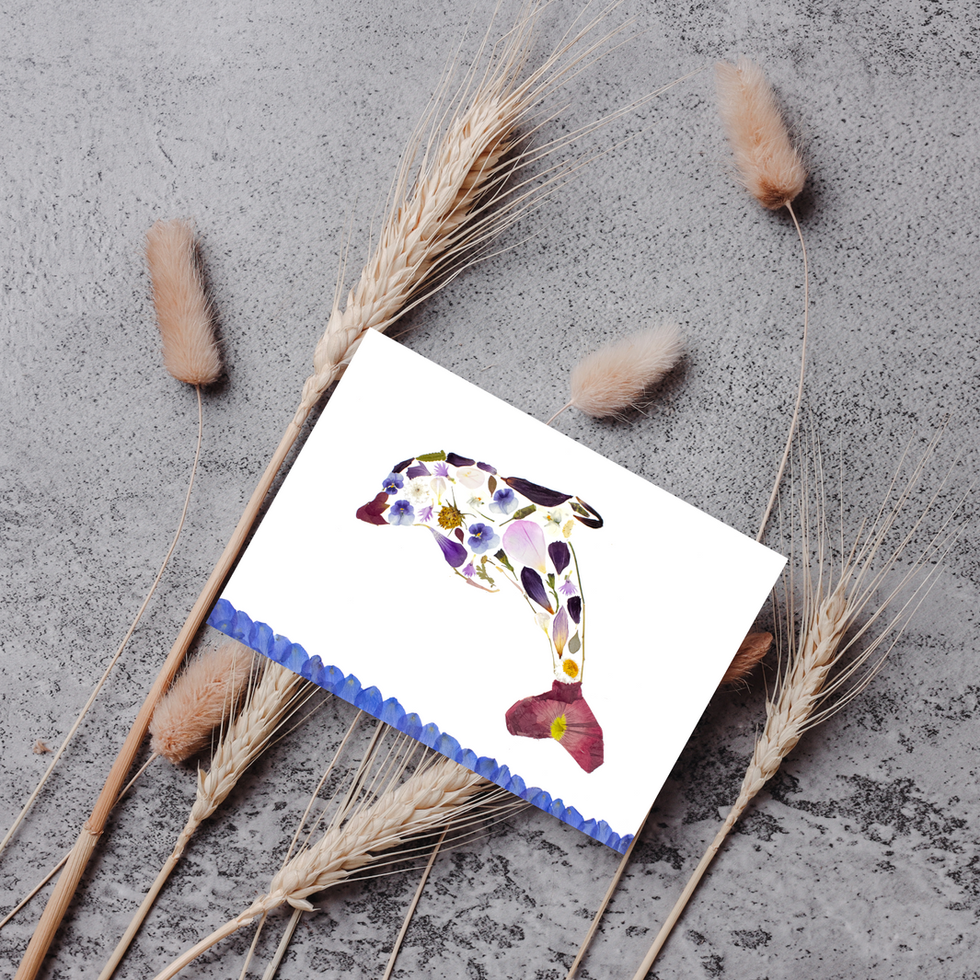 A joyful pressed-flower dolphin created from colorful garden blooms with a wave of blue botanicals below. “Ocean’s Grace” brings coastal movement, charm, and color to any space.