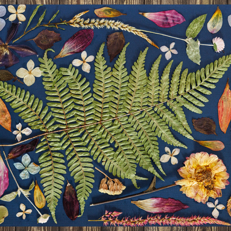 Inspired by the quiet beauty of cottage gardens, Heirloom Garden Placemats feature a delicate collection of pressed flowers, leaves, and garden botanicals arranged across a deep blue background.